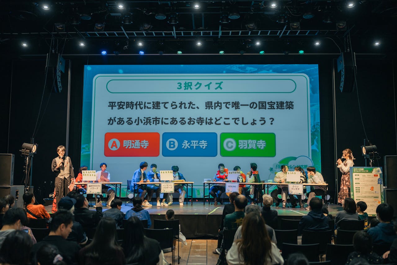 予選を勝ち抜いた県内の高校生4チームが福井の「食」「観光」「歴史」「企業」に関するクイズに挑戦。昨年惜しくも2位だったチーム「9900万パワーズ」がリベンジを果たし優勝しました!また、スマートフォンアプリFWI(福井県若者情報発信局)を使用して、会場全員で優勝チームを予想したり、OOKABE GLASSの大壁社長が1分間で今から何回腕立て伏せができるかをクイズにするなど、会場は盛り上がりを見せていました。