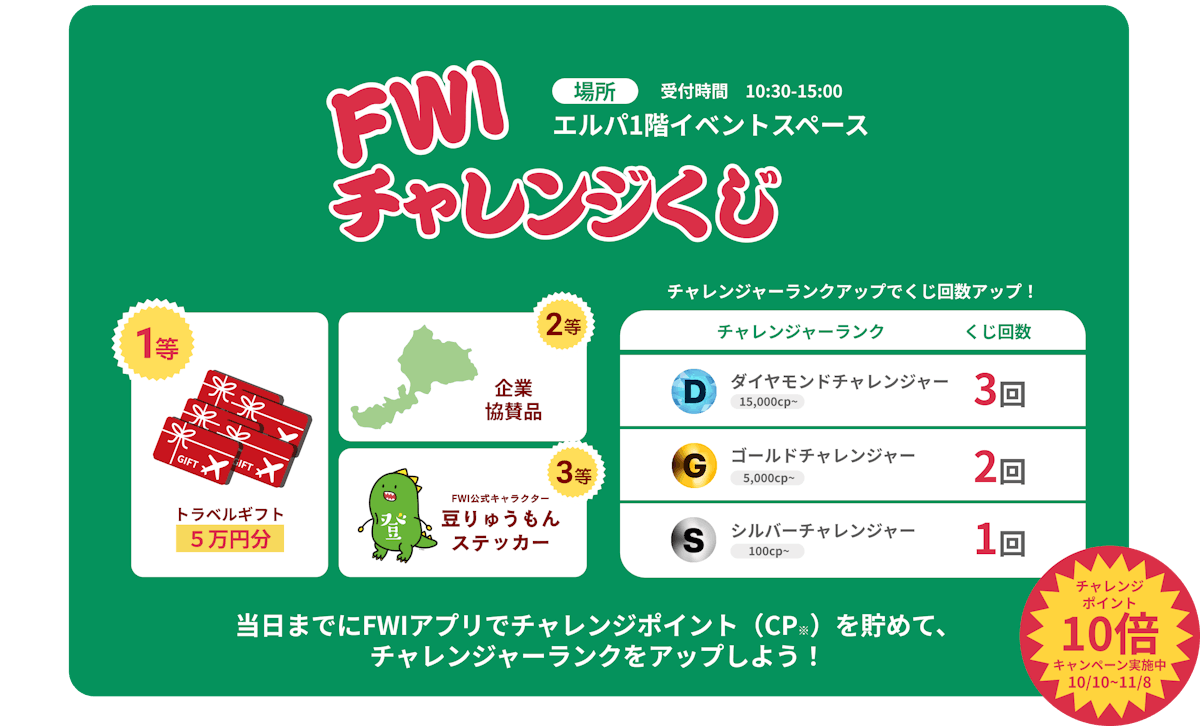 ※チャレンジポイント(CP)とは、スマホアプリ 福井県若者情報発信局(FWIアプリ)で貯めることができるポイントです。貯まったポイントに応じてチャレンジャーランクが上がります。チャレンジャーランクごとに、あなたのチャレンジを応援する様々な優待をご用意しています。この機会にぜひご利用ください。